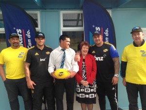 l-r PlaceMakers Porirua employee Tank Lapana, Hurricane Brendon Edmonds, Aotea College captain of the 1st XV Sam Filipo, Aotea College principal Kate Gainsford, Hurricane John Schwalger and PlaceMakers Porirua JV Boyd Kenna came together to celebrate the new pavillian