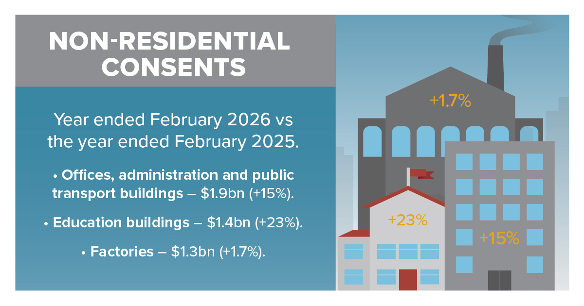 In the year ended February 2026, non-residential building consents totalled $8.9bn, up 0.7% from the year ended February 2025. This series can be influenced by price changes – non-residential construction prices (as measured by the capital goods price index) were up 1.5 percent in the year ended December 2025.