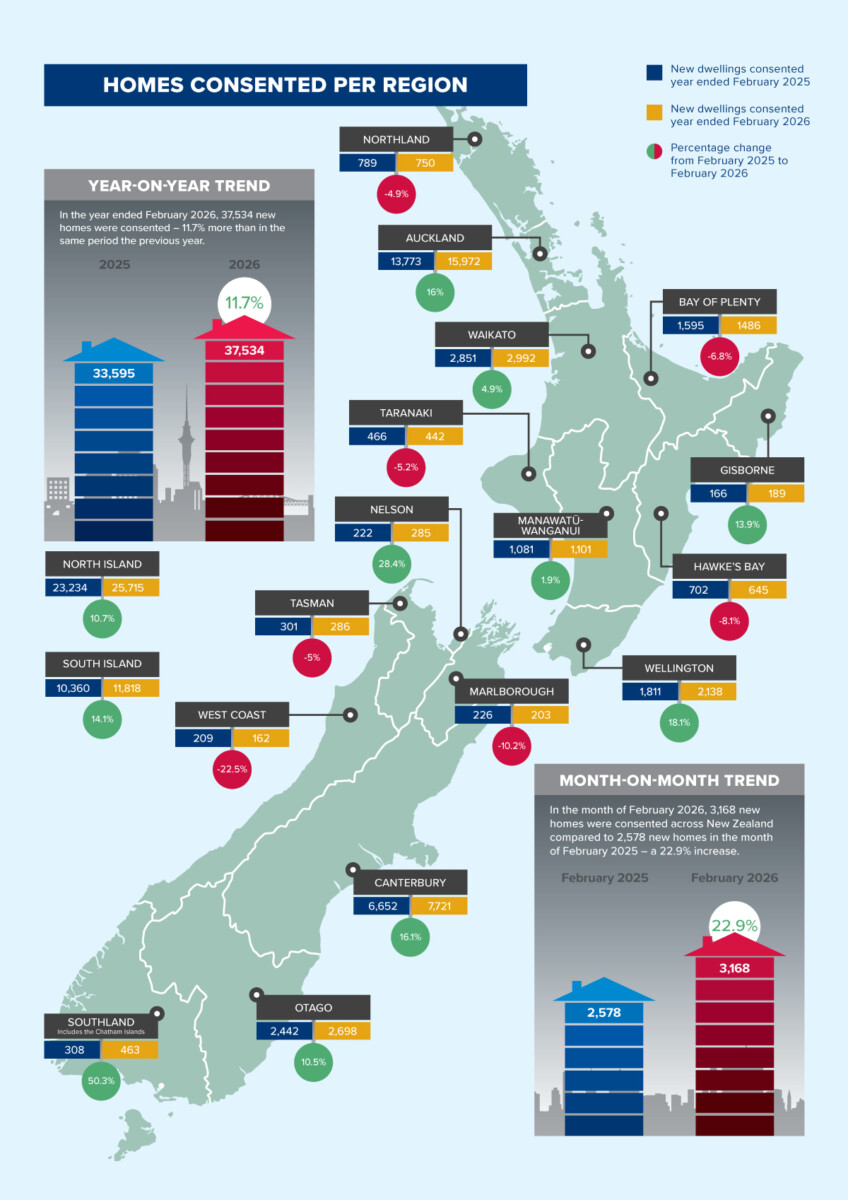 In total, 37,534 new homes were consented in the year ended February 2026 – an increase of 11.7% compared with the year ended February 2025. This included 20,445 multi-unit homes (up 15.2%) and 17,089 stand-alone homes (up 7.8%).